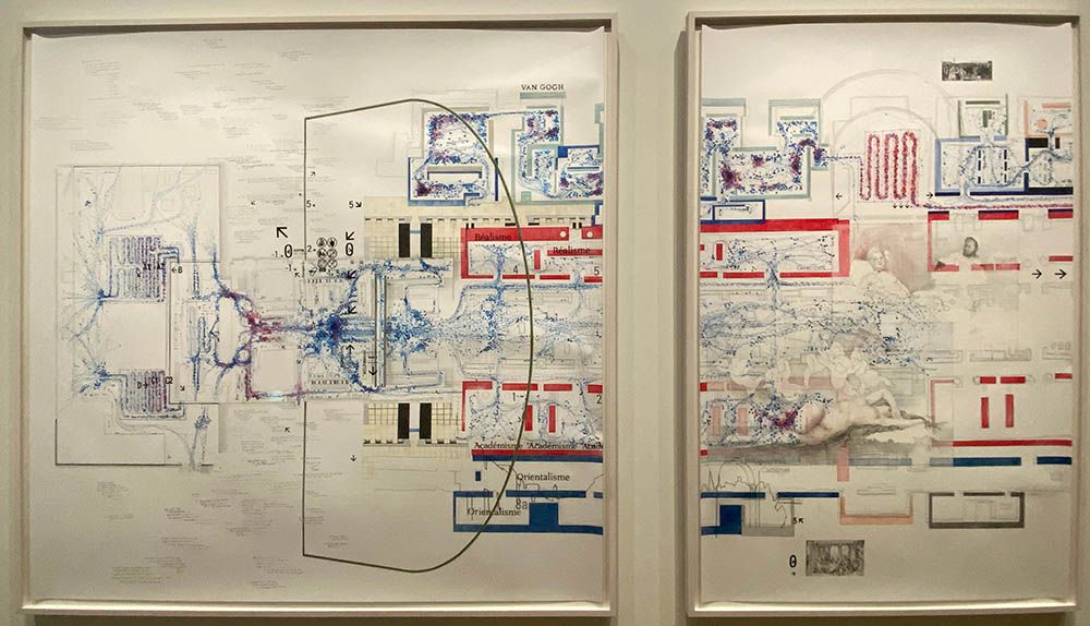 L’artiste canadienne Larissa Fassler, dont la pratique consiste à cartographier empiriquement des lieux publics afin d’exposer visuellement les relations entre ces espaces et ceux qui les fréquentent a été invitée à mener ses recherches au musée d’Orsay, dans la perspective des grands travaux de réaménagement que l’établissement prévoit afin de fluidifier l’accès du public.