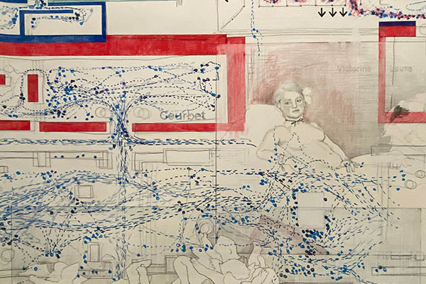 De septembre à novembre 2023, Larissa Fassler a passé trois mois à arpenter quotidiennement le musée d’Orsay. Elle a commencé par cartographier le musée en utilisant son propre corps comme outil de mesure. Chaque espace a ainsi été restitué sous forme d’une esquisse préparatoire dessinée à la main.