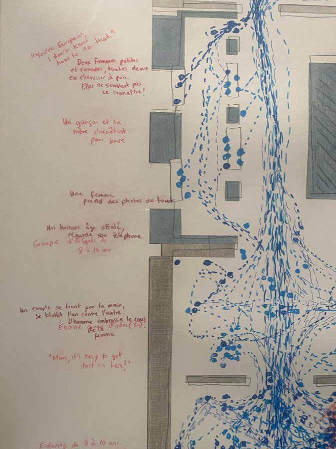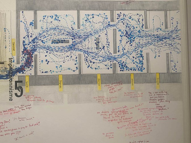 Sur ces dessins, elle a ensuite tracé les déplacements des personnes dans le musée : au stylo bleu, un point indique l’endroit où quelqu’un s’est arrêté ; une ligne en pointillés montre son parcours, devenant rouge lorsque l’atmosphère changeait : quand les visiteurs semblaient bloqués, frustrés, tendus ou agités.
