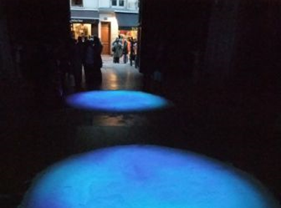 Tout commence ainsi par une invitation : deux ronds bleus sur le sol