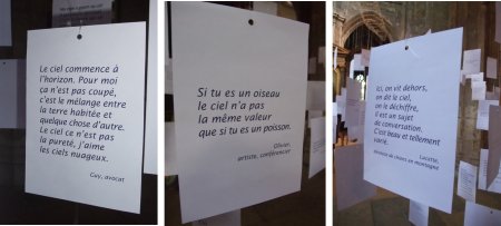 Il est ainsi proposé une « déambulation » dans l’espace de l’église, puisque tel est le sous-titre de cette manifestation, dans une atmosphère qui n’est pas sans rappeler un peu celle de l’Arsenale lors des Biennales d’art contemporain de Venise : des œuvres très actuelles, des médium divers suscitant l’émotion ou la réflexion dans un cadre à forte valeur patrimoniale. Il s’agit de parler du ciel d’aujourd’hui en dehors du champ religieux, alors que des tableaux, des vitraux et des sculptures qui du XVIIe au XIXe ne cessent de parler de cet élément pour des besoins métaphoriques religieux et spirituels. Deux représentations du terme se juxtaposent sans se heurter.