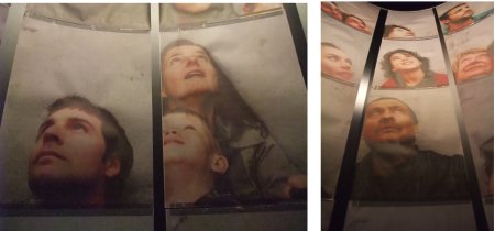 S’asseoir et regarder le ciel (photos de Fabien Breuvart, qui est un militant du rapport au public et de causes politiques comme la dignité des étrangers) agit en contrepoint : des tubes noirs (à droite ci-dessus) n’ayant que des photos, dans l’autre partie du déambulatoire. Une métaphore de la complémentarité du ciel la nuit et du ciel de jour ?