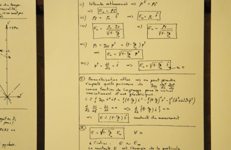 Le ciel objectivé (Parcours de la Théorie des champs d’Alain Laverne) est un clin d’œil de scientifiques qui voient souvent dans les découvertes de véritables œuvres. Il y a du charme dans l’écriture appliquée de ces équations qui peuvent rappeler bien des souvenirs à certains visiteurs. Ce mystère de la matière calligraphié dans des équations et des dessins tient de l’art conceptuel des années 70 ! Le passant n’y comprend rien, mais l’intention/démonstration trouve sa forme.