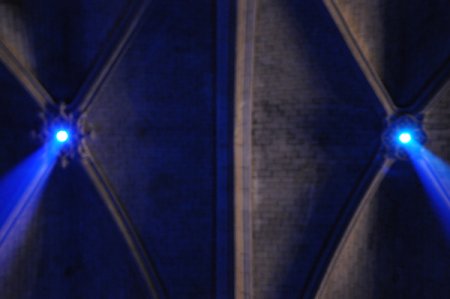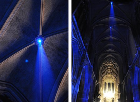 Tout d’abord la surprise, deux grandes taches bleues au milieu de la nef, là où tout le monde passe. Leur dimension est en accord avec celle de l’église. C’est du monumental accessible, autour duquel on peut tourner, dans lequel on peut entrer. La lumière inonde la nef par deux faisceaux simples et bien dessinés dans l’espace, sur toute la hauteur.