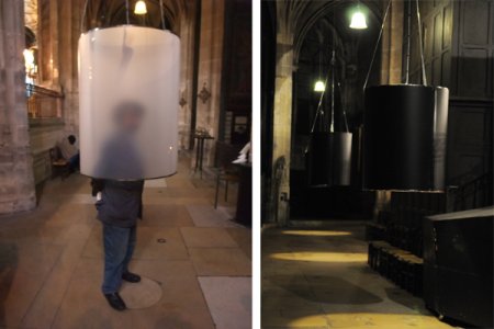 Les regards du ciel (Paroles personnelles, uniques, immédiates recueillies par Sophie Forestier dans de multiples entretiens préalables comme Les colonnes du ciel d’ailleurs) est une suite de textes relevant du théâtre et dits sur le mode de l’intimité, car il faut entrer, seul ou à deux au plus, dans des cylindres translucides. Ces tubes blancs (à gauche ci-dessous) créent une sorte d’abri originaire dans le lieu de passage qu’est le déambulatoire.
