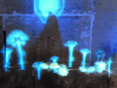 Lorsque l’on rentre dans le claustra de Saint-Merry, on voit projeté, sur un mur de pierre, un aquarium en image virtuelle composé de plantes qui ondulent et de petits crustacés qui tiennent de la larve et du poisson, se déplaçant dans un liquide bleu.