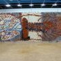 - Deux grandes toiles de soie peintes sur des motifs décoratifs aquatiques lui font face sur la même longueur. La chatoyance de la soie fragile, une référence à un art considéré traditionnellement comme féminin, et l’anguille qui navigue au milieu de la végétation subaquatique s’opposent complètement à la densité de la laine, à la force qu’il a fallu déployer pour tisser et font appel à une autre dimension de la culture. L’échelle est celle de la fresque, et pour cause, puisque c’est le transfert des dessins préparatoires à une fresque de céramique pour le métro d’Amsterdam.
