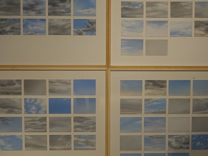 La série est poussée à l’extrême : souvent le même siège, la même table, la même fenêtre, toujours le même type de papier et le même format, celui de la carte postale. Mais les ciels sont toujours différents.