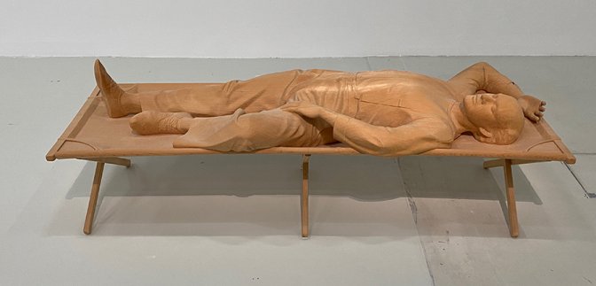 [4] "Comme la Femme endormie, le personnage de Mime est également endormi, mais il dort dans un état plus léger. Son sommeil est délicat, et en tant qu’état d’être, il est similaire à l’acte de mimer. Mais son sommeil est-il une forme de mimétisme ou est-ce lui qui mime le sommeil ?" Charles Ray donne à voir, comme les sculptures depuis l’Antiquité, l’espace non représenté, invisible de vie.