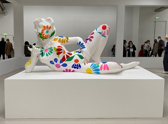 Cette sculpture récente est une des premières faites avec un nouveau matériau peu courant, le papier travaillé en atelier. Ce modèle plus grand que nature a été élaboré à partir d’une statuette bon marché, non plus en monochromie, mais avec de grandes fleurs à la gouache dans l’esprit post 68, signe aussi qu’il aime peindre.