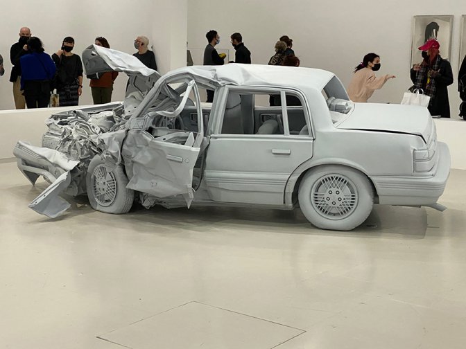 Si certains artistes ont mis dans les musées des voitures accidentées, jusqu’à les faire nettoyer chaque jour comme un bel objet, ou encore complètement compressées, leur esthétique portait la critique de la société de consommation. Charles Ray, lui, a fait le lien entre une voiture accidentée et un sarcophage, un amas de pièces hanté par un fantôme. C’est la visée formelle qui l’a guidé. Il a donc fait démonter toutes les pièces, les a moulées en fibre de verre, puis les a remontées une à une en unifiant le tout par une peinture grise. Le drame s’est estompé, la pureté de la forme a mis à distance le chaos.