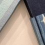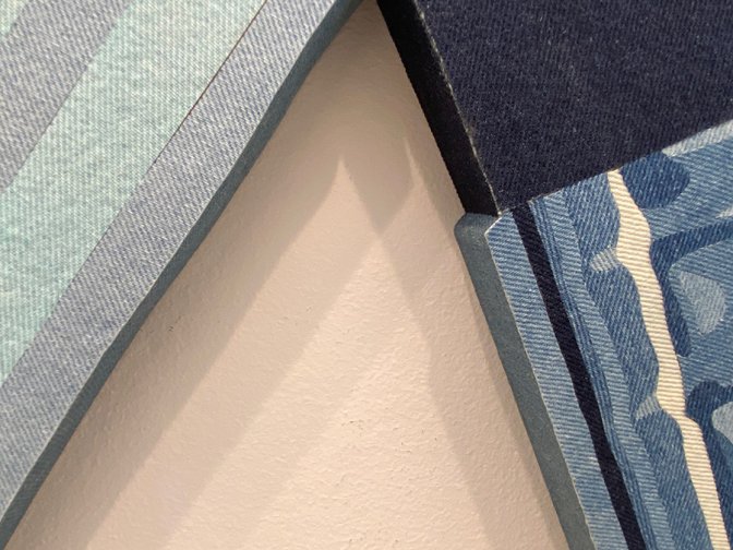 Il faut donc se rapprocher pour admirer une sorte de marqueterie d’un genre nouveau faite de motifs en denim, teintés dans une variété de tonalité. Tout se passe comme si l’artiste avait fait du collage de morceaux de jean, le symbole culturel des USA qui s’est diffusé dans le monde entier.