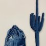 Le cactus et à côté un sac-poubelle, les deux traités frontalement à plat et créant l’illusion du relief, parlent probablement du désespoir des mythes de la conquête de l’ouest.