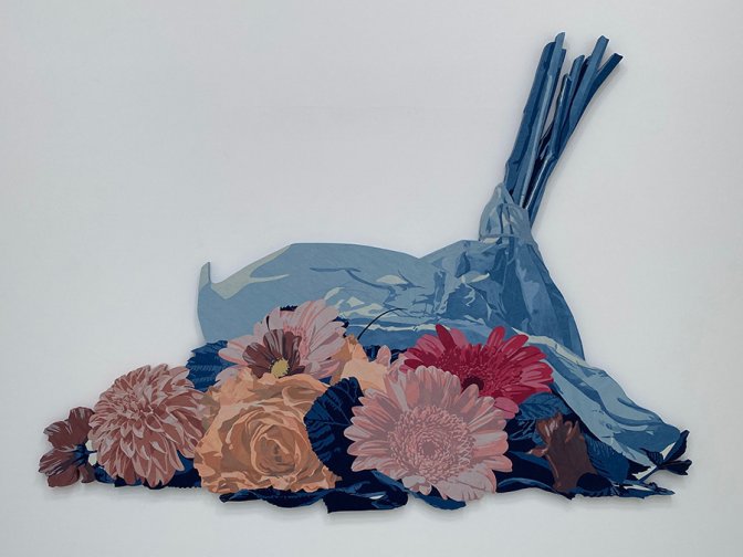 Nick Doyle, né en 1983 en Californie, vivant et travaillant désormais à New York, réalise des tableaux-objets en tissus de jean. Virtuose de ce médium très rarement utilisé, il développe une vision pop de l’Amérique, utilise ses codes et ses symboles du quotidien, non plus pour critiquer le système de consommation, mais pour constater la crise d’identité chez les personnes intégrées socialement. Alors que, sur des thématiques analogues, de grands artistes avaient adopté un style trash et violent, il choisit une technique élégante et des objets immédiatement lisibles (un bouquet de fleurs, une cravate coupée, un pot de peinture renversé) pour symboliser la vanité des anciens repères virilistes, en reprenant les clichés représentant l’ American Dream et sa culture.