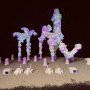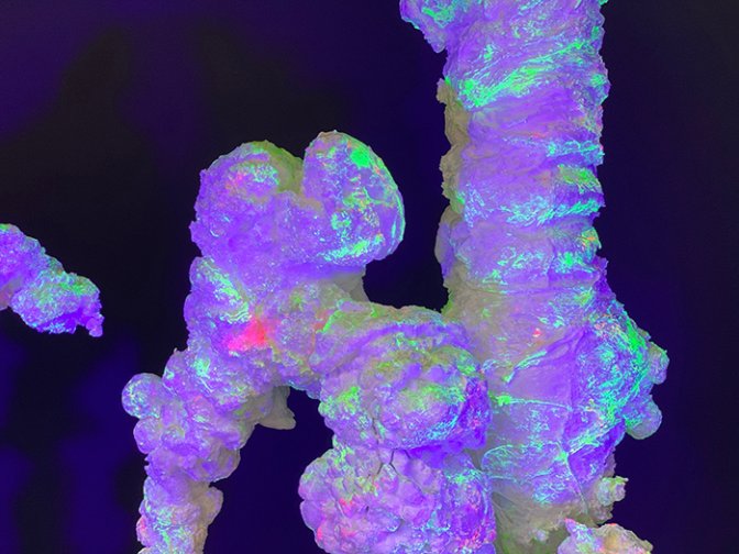 L’ensemble est déposé avec délicatesse et ordre sur un tapis de granulés de béton et dominé par des sculptures blanches, violettes, vertes phosphorescentes, de volutes d’eau éclairées de lumière noire. Ces représentants de « Cumulus mediocris homogenitus » comme les appellent les artistes tiennent de l’organique, du phallique, du grotesque, mais aussi de la poésie. Ces sujets visuels fascinent par leurs coloris et attirent l’attention sur leur origine : les centrales sont-elles des lieux de beauté ou d’inquiétude ? Le titre « Printemps nucléaire », auquel la commissaire a accolé « Fleur de Lys », est étonnant pour une saison d’œuvres de cette galerie censées traiter du vivant. La beauté est ici grinçante et ne peut qu’évoquer le débat politique actuel sur le nucléaire et sur les projets de mini-centrales dispersées dans les agglomérations, et donc le discours des risques pour le vivant.
