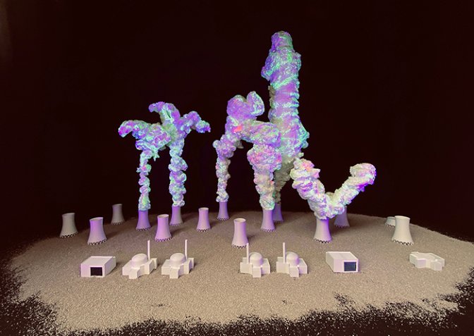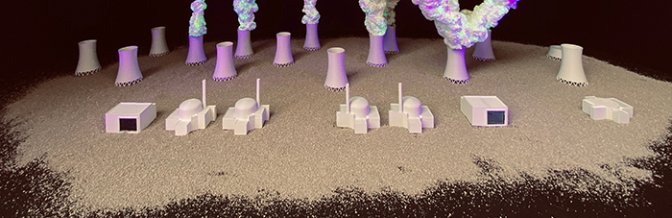 Un paysage de centrales nucléaires est traité comme un univers de jeu pour enfants : des petites maquettes de quatre centrales, deux bâtiments de contrôle, quinze tours de réfrigération, un centre technique. Le tout sort d’une imprimante 3D, les artistes auraient pu en mettre plus sans effort. Cette installation sur notre temps par sa thématique est aussi de notre temps par sa technique.