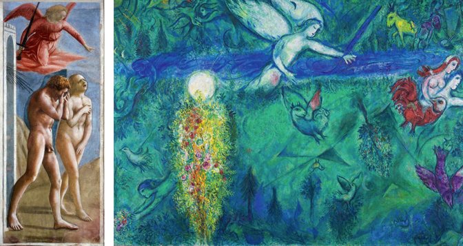 Dans ces représentations, le mouvement est celui de la fuite, le paysage du paradis quitté peut-être luxuriant, et un troisième personnage, l’archange, les chasse avec une épée.