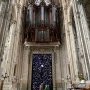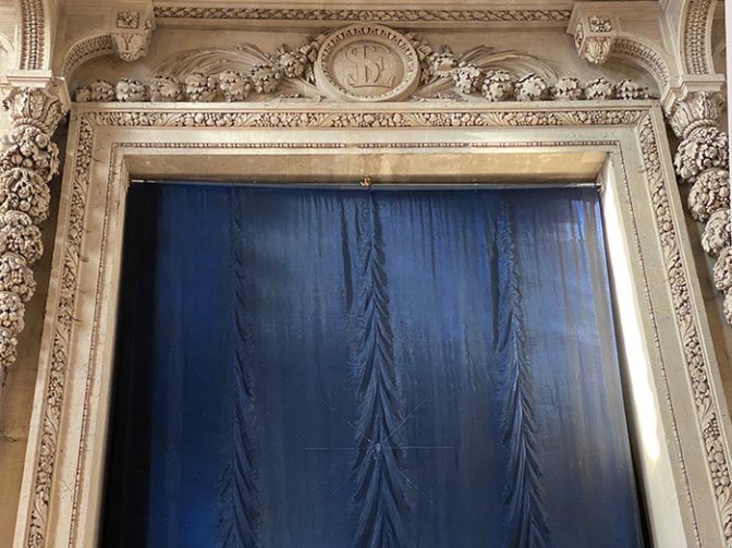 Grandeur : une œuvre de la taille de la porte monumentale, 9,25x5,25 m ! suspendue miraculeusement sur une simple barre. Une œuvre à l’échelle de l’église.