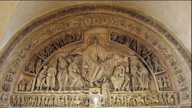 Il est ainsi surprenant de retrouver dans Astre la conception du portail du narthex de Sainte-Marie-Madeleine à Vézelay où, au centre, se trouve le Christ (/étoile du berger) et tout autour les signes du zodiaque (/constellations). Qui plus est, des mains du Christ en Ascension surgissent des rayons (sur les apôtres) (lire ainsi que J2M) comme dans l’organisation des éclats lumineux d’Astre.