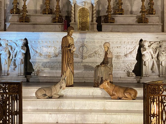 D’où cette année la présence des deux crèches l’une parlant de lumière et de nativité, l’autre évoquant une scène rurale, l’aujourd’hui / la tradition, et placée symboliquement à l’opposé, derrière le chœur, dans la chapelle de la Vierge. D’où aussi un nom spécifique (« Astre » et non crèche) donné à l’œuvre de Clara Daguin. Et pourtant n’y a-t-il pas une certaine merveille dans la cohabitation de deux sensibilités ? Le bois ancien, le stable et le figuratif / le tissu, la créativité et la lumière.