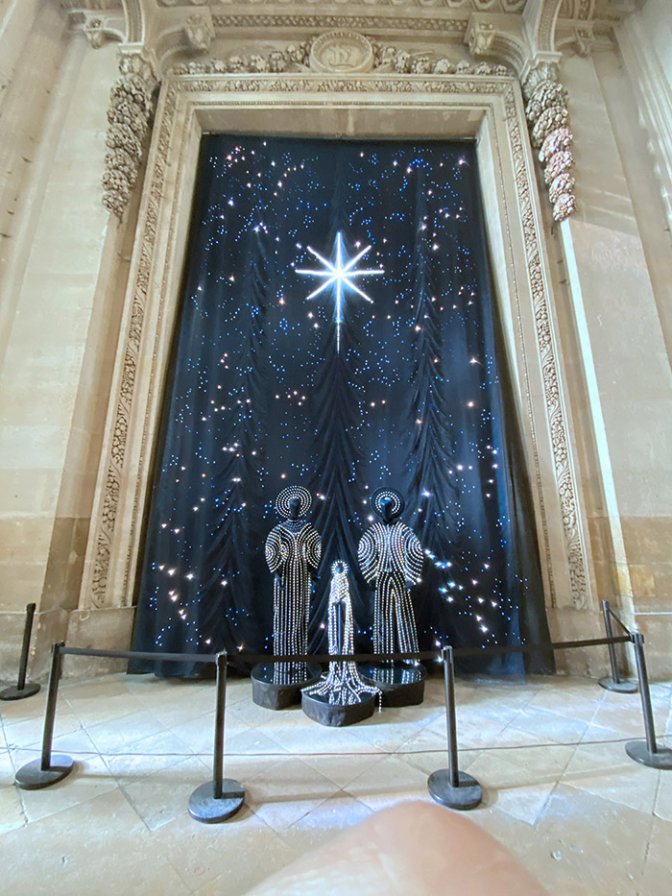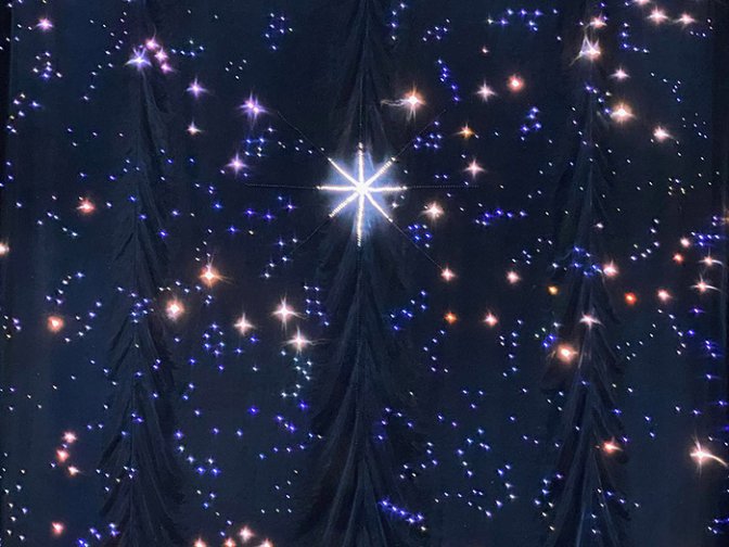 Perfection : douze toiles disposées en arc, douze représentations des constellations du zodiaque, d’où émerge l’étoile. Et devant, trois personnages, des mannequins de tissu brillant noir, Marie, Joseph et l’Enfant, habillés de rubans brodés de leds, des habits aussi créatifs et élégants que pour des créations de haute couture. Une invisibilité de la technique électronique, chaque led étant programmée différemment, partout dans ce splendide tissu.