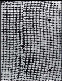 « il utilise depuis de nombreuses années des surfaces trempées dans la peinture et appliquées sur des toiles, généralement de grandes dimensions, pour réaliser des sortes de contacts, des empreintes, qui mettent ses œuvres au plus près du réel. Commencée avec des rideaux, l’œuvre a continué avec des draps, des robes, des grilles métalliques… Tous les objets ont des volumes ou une trame, avec plus ou moins de reliefs qui permettent à la peinture, lors du contact, d’occuper le tableau. »