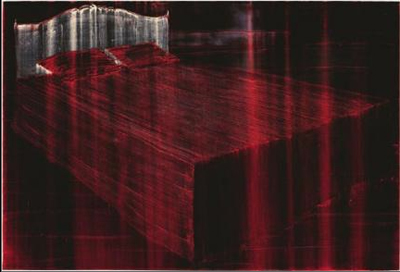 Le lit : ces grands lits dans une pièce vide sont des formes meublées de ce tombeau vide. Il s’agit d’absence des corps, de ceux qui se reposent ou s’aiment. Le vide pour évoquer l’homme. Avec« Between nowhere and Goodbye », l’absence, bien plus légère, par la figure d’un ciel étoilé, pour dire peut-être un autre type d’absence.