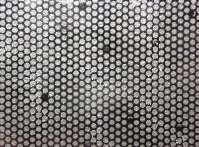 Les points blancs constituent un fond sur lequel se déploient des points noirs : une constellation inversée. Les quelques imperfections indiquent que c’est bien de la peinture, minutieusement apposée qui, la nuit, avec l’éclairage interne, devient argentée.