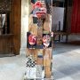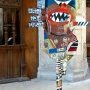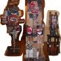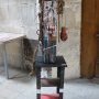 « Objet de culte » (176 cm) utilise les mêmes composants que les précédentes sculptures, non sans un certain humour, il présente son grand masque comme dans les galeries des Arts Premiers sur un socle : un tabouret peint.