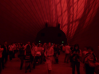 Anish Kapoor a voulu expressément que nous prenions connaissance de son œuvre par l’intérieur d’où l’aveuglement du hall d’entrée du Grand Palais