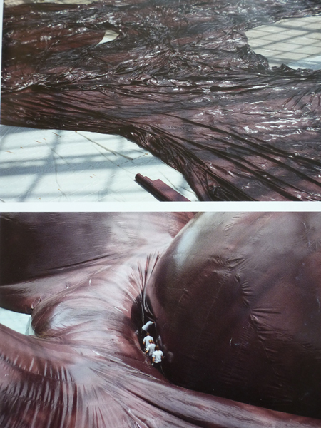 La toile a été fabriquée à partir de lames de tissu collées. La structure est complètement lisible par les bandes de collage et donne au visiteur l’illusion d’être dans un corps de monstre dont il voit les vaisseaux sanguins.