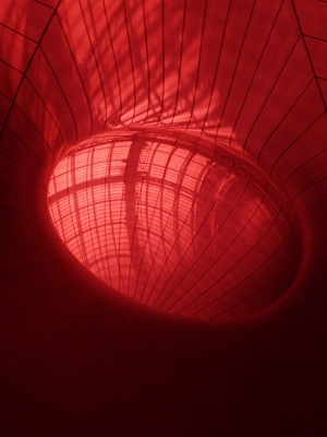 La toile a été minutieusement conçue par des équipes d’ingénieurs, elle est translucide, rouge sang, on dira peut-être plus tard « rouge Kapoor » comme on dit « bleu Klein » ou « verre Grand Palais ». Ce monochrome change de tonalité à l’intérieur du fait de la forme et des jeux de lumière provenant de la voûte du Grand Palais. Il évolue bien sûr dans le cours de la journée, mais l’expérience vécue est toujours aussi forte.
