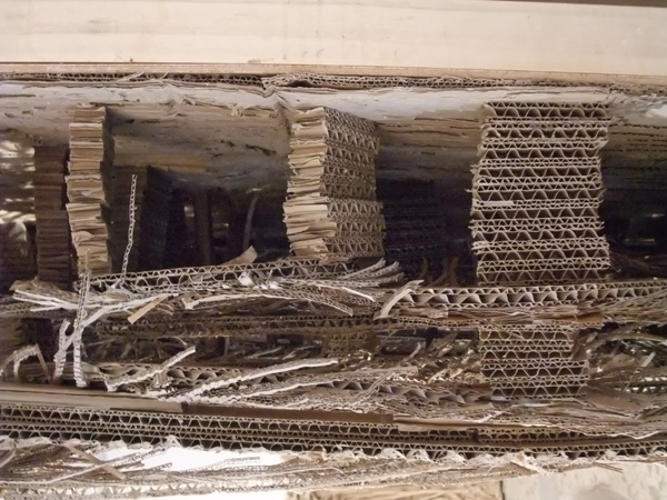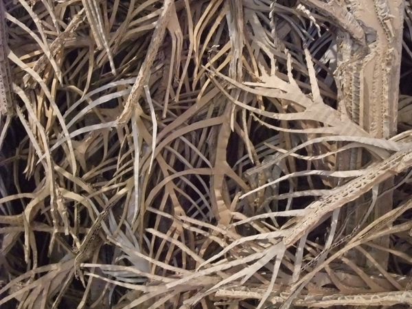 Un matériau, le carton ondulé banal et récupéré, insolite sculpté, collé, déchiré, griffé dévoilant la surface et les cannelures, où les composants de fabrication sont autant de coups de crayon, de pinceau.