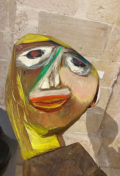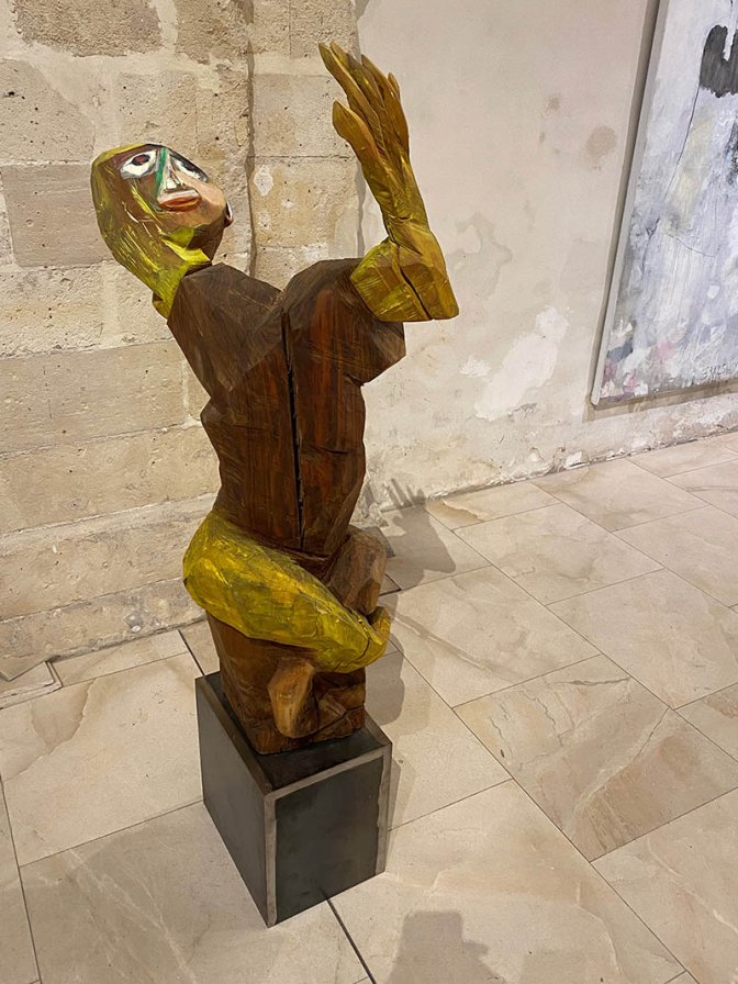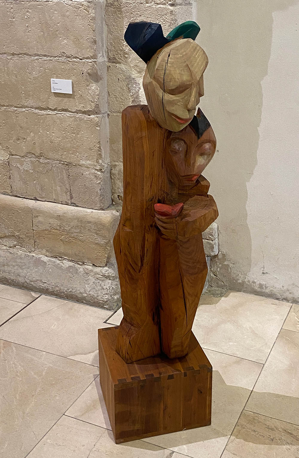 In love (2023). Cette statue en cerisier de 156 cm, disposée subtilement devant une grande toile diaphane (Tous les enfants dorment) se veut l’opposée de la précédente. Elle est une représentation de la tendresse d’une mère pour son fils. Il ne s’agit pas d’une vierge à l’enfant, mais d’une femme enserrant un adolescent, les deux goûtant un instant de bonheur. Un cœur dans la main confère une touche de dessin animé. Quelques éléments de couleur ont été apposés, noirs pour les cheveux, rouges pour les lèvres et le cœur. Cette œuvre reflète l’affection dont l’artiste entoure ses œuvres et fait écho à des toiles qui révèle son regard d’enfant : Danse des chèvres, Les chats dans le jardin, Danseurs, Jeune fille, S’Karpel ( un personnage de marionnette), Le pré, Arlequin et Arlequine, La sirène. Il s’en ressent l’humour et la naturelle joie de vivre d’Hans.