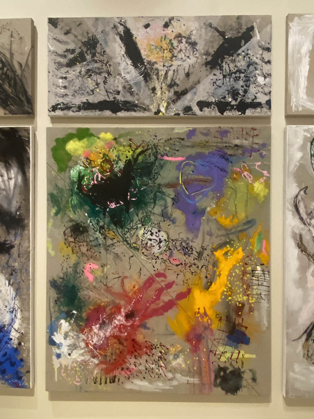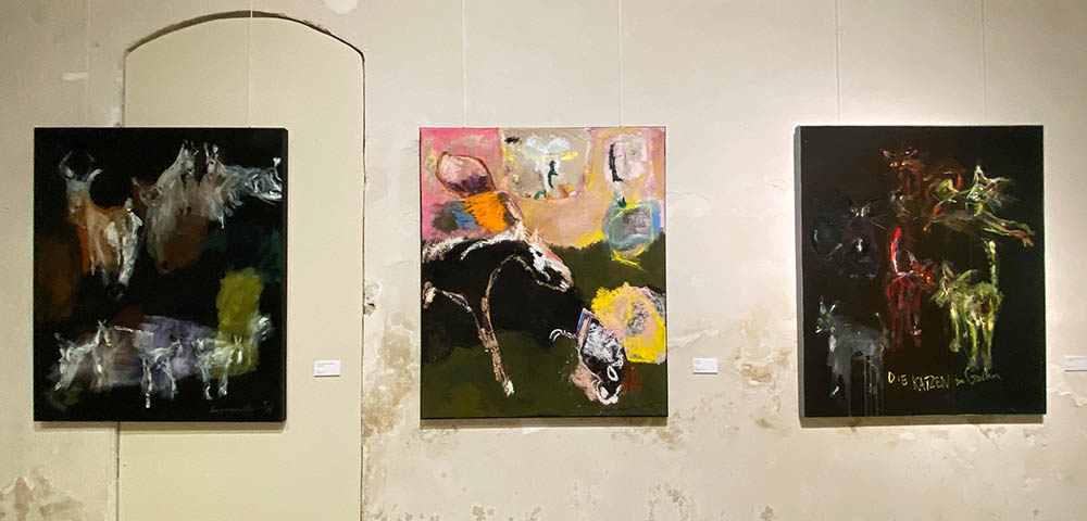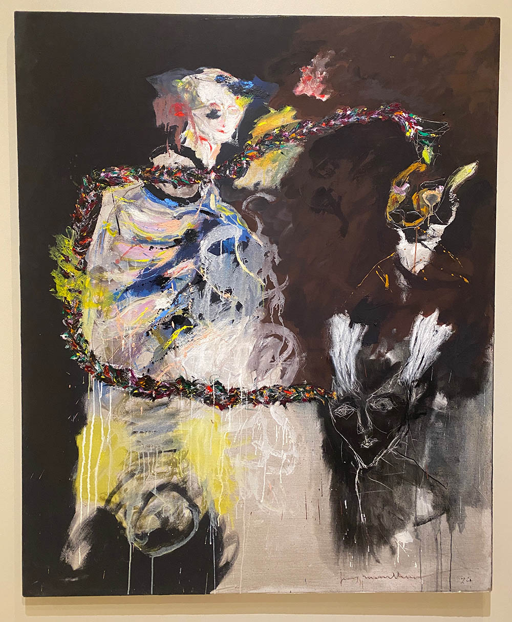 Mythe, 2024. 190 x 150, est une toile centrale dans l’exposition. Sur un fond très sombre, à l’instar des récits mythiques, trois personnages occupent l’espace dans des styles différents. Une femme, au visage blanc, doté d’un corps recouvert d’un tissu délicatement coloré, distribue la place des deux autres figures : une tête d’animal aux oreilles marquées, et une silhouette de visage, d’un temps ancestral, tel un masque africain. Les trois personnages sont reliés par une tresse colorée, telle une suite de fleurs. Dans l’œuvre d’Hans Mendler, le mythe se veut être un lien avec une source ancienne, qui prend forme chez des êtres vivants non humains, comme les animaux, mais qui concerne la femme ou l’homme d’aujourd’hui. L’artiste est un homme de liens entre pensée et émotions. Il y a du spirituel et une recherche des origines comme on le trouvait dans la Transavangarde.