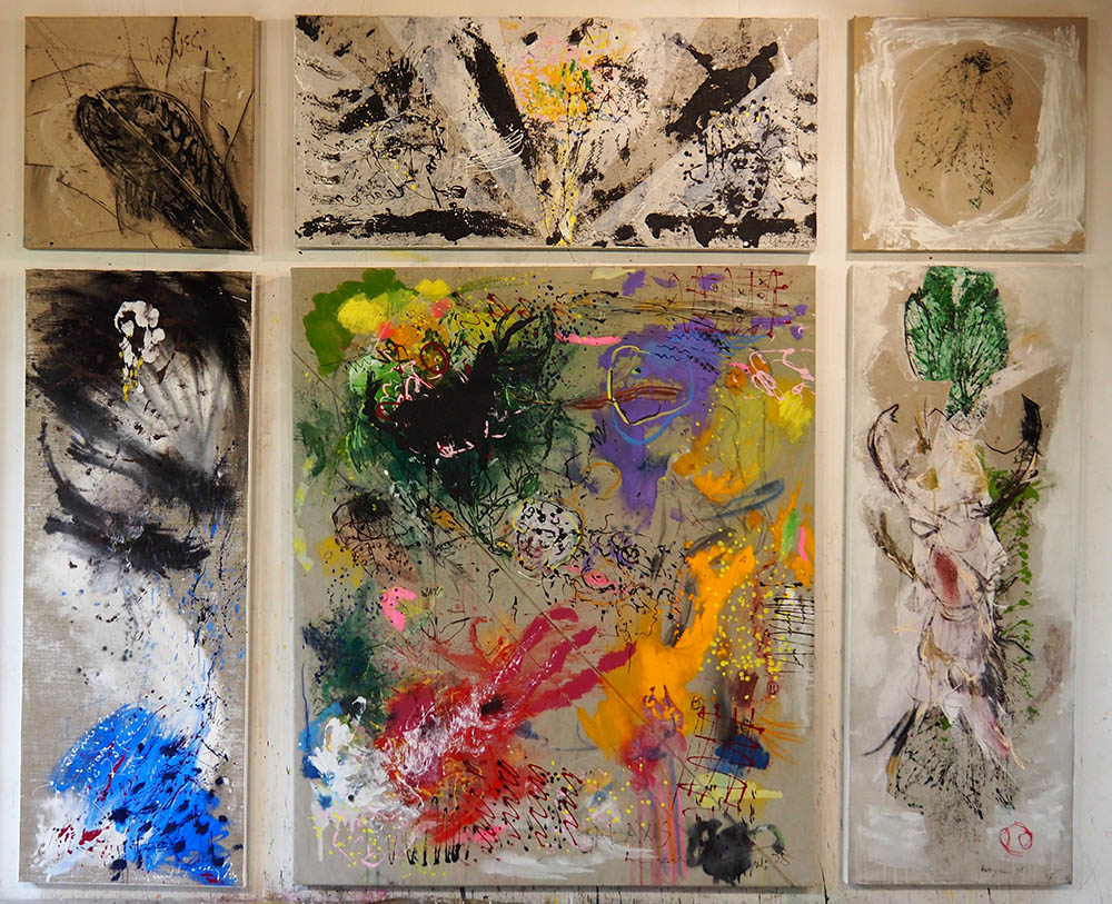 • Galaxis, 2025, acrylique, 190 x 160, exprime la richesse des potentialités de l’univers dans toute sa diversité. Un ciel qui n’est pas noir, mais où s’inscrivent dans une profusion colorée étoiles et planètes dont une partie est symbolisée dans le zodiaque.