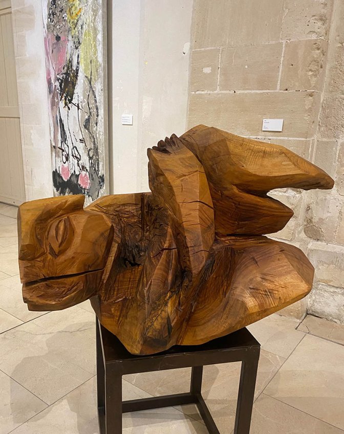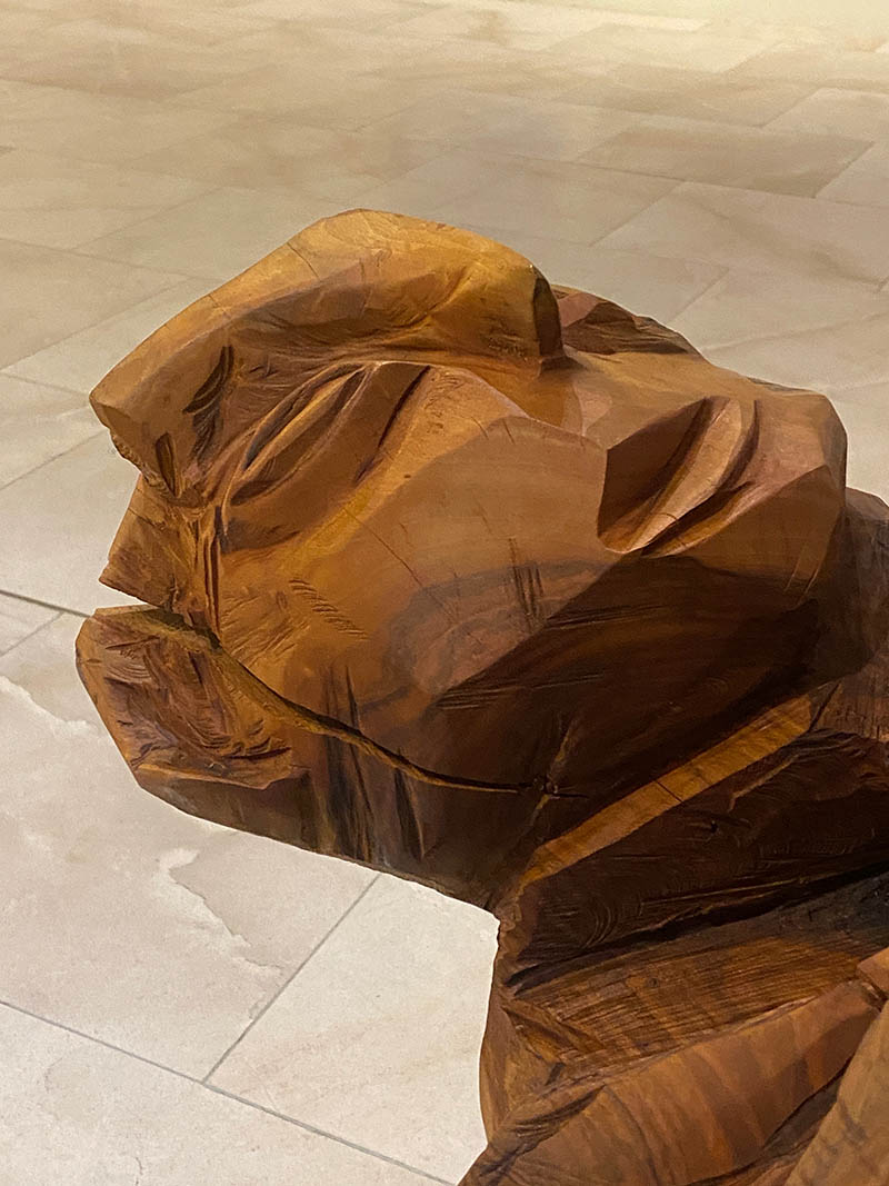 Salto (2024). Généralement, Hans Medler sculpte ses morceaux de tronc d’arbre à partir de leur verticalité. Dans cette œuvre, il a posé un tronc de noyer à l’horizontale et fait émerger un corps dans son ensemble, lové et en tension sur lui-même, en conférant à la tête une taille considérable qui est taillée de manière cubiste avec de multiples facettes. Le bois n’est pas peint, mais laisse refléter ses veines finement polies. Avec les fissures de l’homme, Hans a saisi l’effort. Est-ce celui de l’artiste quand il affronte la matière ?