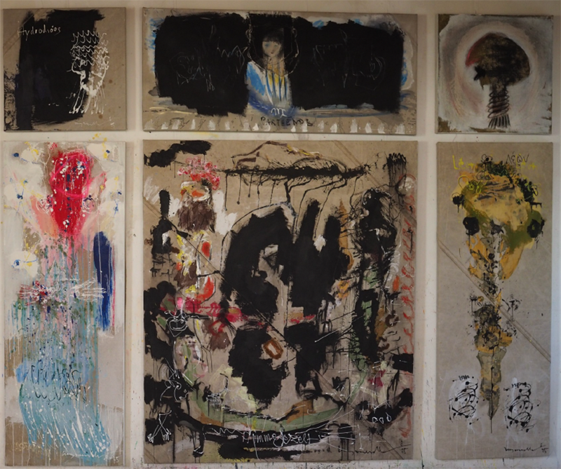 Le mythe est une substance toujours vivante, à l’instar de personnages traversés de forces, de souffles, de signes, tel un archipel de mémoires. L’artiste ne peint pas des dieux, mais leur passage au milieu des femmes et des hommes. Il peint la trace qu’ils laissent dans la matière, dans nos yeux, dans le temps, dans le paysage et ses ciels habités de nuages.