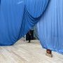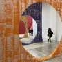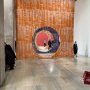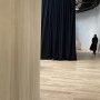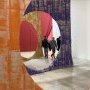 L’exposition s’ouvre dès le hall d’entrée sur une vaste installation de rideaux peints que les visiteurs sont invités à traverser. Percés d’un grand cercle, ils rappellent tout autant le diaphragme d’un appareil photographique qu’une série de seuils à franchir. Comme une ouverture fantasmée vers l’exposition dévoilant déjà l’envers du décor, cette installation offre une première immersion dans la couleur.