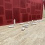 La traversée se poursuit autour de cinq cabanes à la géométrie incertaine. Réalisées avec des tissus colorés provenant de pièces antérieures de l’artiste, elles renvoient chacune à une fonction ou à une temporalité : action, figure, rituel, nuit et habitat. Tous les samedis, cinq performeuses et performeurs construisent et déconstruisent ces espaces en manipulant les œuvres-accessoires qui y sont présentées : des morceaux de craie surdimensionnés, des cordes, des bols, des cannes à pêche, des kilts, des rubans... Le déplacement hebdomadaire de ces objets crée des combinaisons singulières, des récits sans cesse renouvelés. L’exposition affirme sa capacité à se transformer.