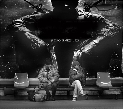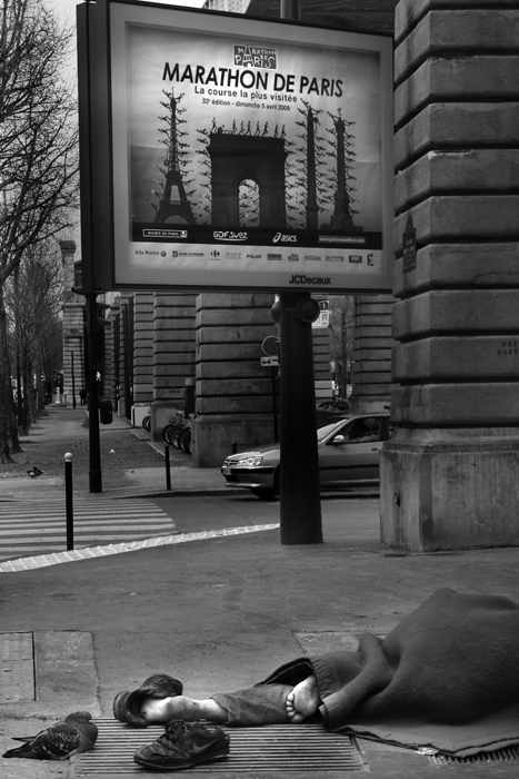 V&D : Ta nouvelle exposition aurait pu s’appeler Voir et Dire, puisque tu associes, ou confrontes, des messages donnés par la ville et un regard sur la réalité vécue par ses habitants. Elle relève aussi d’une sorte d’esprit Plantu, car c’est de société dont tu parles dans ces courts-circuits du regard. Qu’est-ce qui te motive ici ?