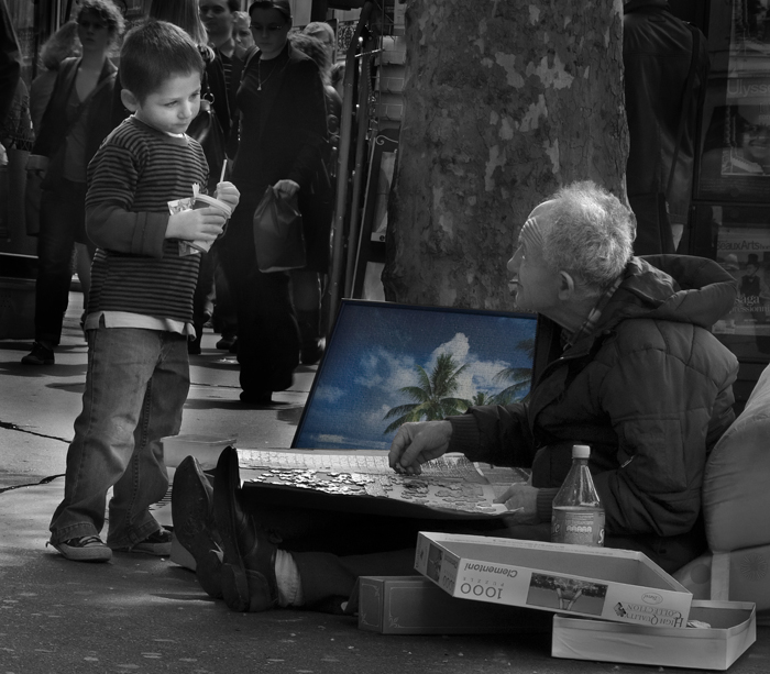 L’artiste est avant tout une photographe de l’individu en situation urbaine : le cadre et l’employé, le vieux et le jeune, le SDF et l’établi…