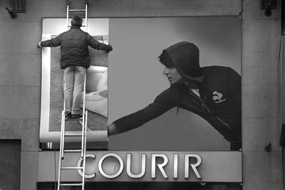 VS : Les injonctions commerciales ou « citoyennes » qui polluent plus qu’elles ne fleurissent nos murs me semblent de plus en plus déconnectées de la réalité de ceux qui les regardent ou les subissent. Elles semblent fonctionner dans une logique propre qui n’est plus celle de la rue et encore moins celle des individus. La consommation infinie qui est leur soubassement et leur nécessité se heurte aux limites flagrantes des pouvoirs d’achat. L’économie redouble donc d’efforts et d’impératives exhortations pour nous maintenir dans une humeur dépensière. Du coup le contraste entre le monde auquel on voudrait nous faire adhérer et notre réalité intérieure devient de plus en plus criant.