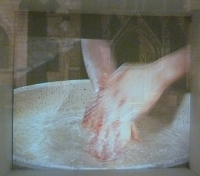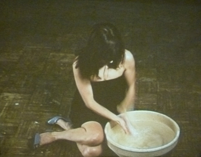 Une vidéo en boucle composée de quatre plans séquence : des mains, un corps penché, des cheveux. De cet autoportrait de l’artiste, on n’apprend rien hormis cette volonté obsessionnelle de faire disparaître une tache invisible par une eau limpide.