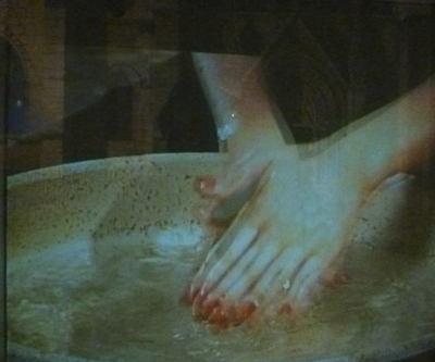« Tout commence par un gros plan sur les yeux de l’artiste, continue par une vision de ses mains aux ongles rouges plongées dans une vasque d’eau posée au sol, puis par une vue générale d’elle assise seule par terre. Ces trois visions alternent en boucle, cette gestuelle lente et répétitive transmet autant une angoisse diffuse qu’une volonté de pureté. Le montage, l’esthétique, le rapport au temps, contribuent à donner à ce geste simple différents niveaux de lecture. » Daria de Beauvais (Commissaire)