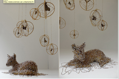 Mes œuvres découlent d’un travail sur les grottes de Lascaux et d’une étude de Chantal Jègues-Wolkiewiez, une anthropologue assez critiquée. Elle met en évidence que, dans la salle des Taureaux de la grotte de Lascaux, où le soleil entre lors du solstice d’été, la place de chaque peinture zoomorphe correspond à celle d’une étoile sur la carte de la voûte céleste. Elle en conclut donc que les Solutréens devaient y tenir un culte solaire. Mon travail sur les animaux-constellations s’inspire de ces théories. Les clous plantés dans le corps de ces animaux empaillés et les fils et broderies qui les relient viennent amplifier le volume du corps et la frontière de la peau devient poreuse.