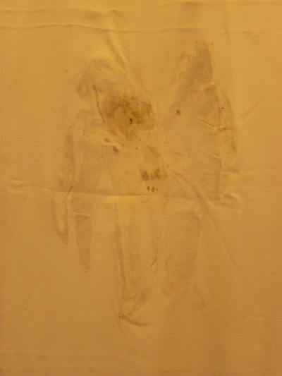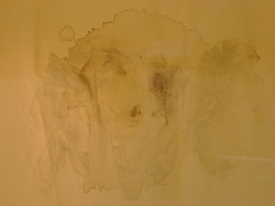 Une étoffe de soie, tachée, est la seule présence dans l’espace offerte au regard du visiteur. Les taches ont été réalisées en posant directement sur l’étoffe un silure, poisson d’eau douce connu pour sa grande taille et sa longue vie. La tache, comme extraite du dos du silure, est une métaphore de l’histoire du fleuve, un négatif de l’environnement de l’artiste, transposé dans une zone urbaine. Il s’agit également d’une tentative de l’artiste de montrer que la raison ne peut pas tout expliquer.