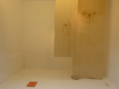 L’installation épurée attire le regard. Tout l’espace est bien organisé, chaque chose semble occuper une juste place et équilibre les autres : les murs sont blancs, les deux trames de tissu aussi, à leur pied un livre rouge fermé dont l’auteur serait l’artiste, une coquille (et il y en a deux autres, paraît-il, derrière les trames). Les trames sont verticales, tels des humains, et, à la place de la tête, une sorte de froissement du tissu ou une étrange souillure. Rien n’est évident et tout semble lié à un sens caché. L’émotion est contenue, d’où vient-elle ?
