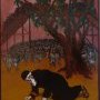 Dans ce tableau étrange, Gérard Garouste rappelle un drame fondamental dont il a parlé dans son livre d’entretiens. Le sous-main est le cadeau empoisonné que lui a fait son père : il renfermait le butin de la spoliation d’un marchand juif durant la Seconde Guerre mondiale. L’artiste le charge du poids de la culpabilité devant un âne dont les attributs bibliques sont ceux de la bienveillance et de la sagesse. L’homme, une personnalisation de son père, a un aspect démoniaque et lubrique. La scène a lieu dans une forêt qui est une image de l’inconscient, l’ensemble s’ouvrant sur une réflexion introspective.