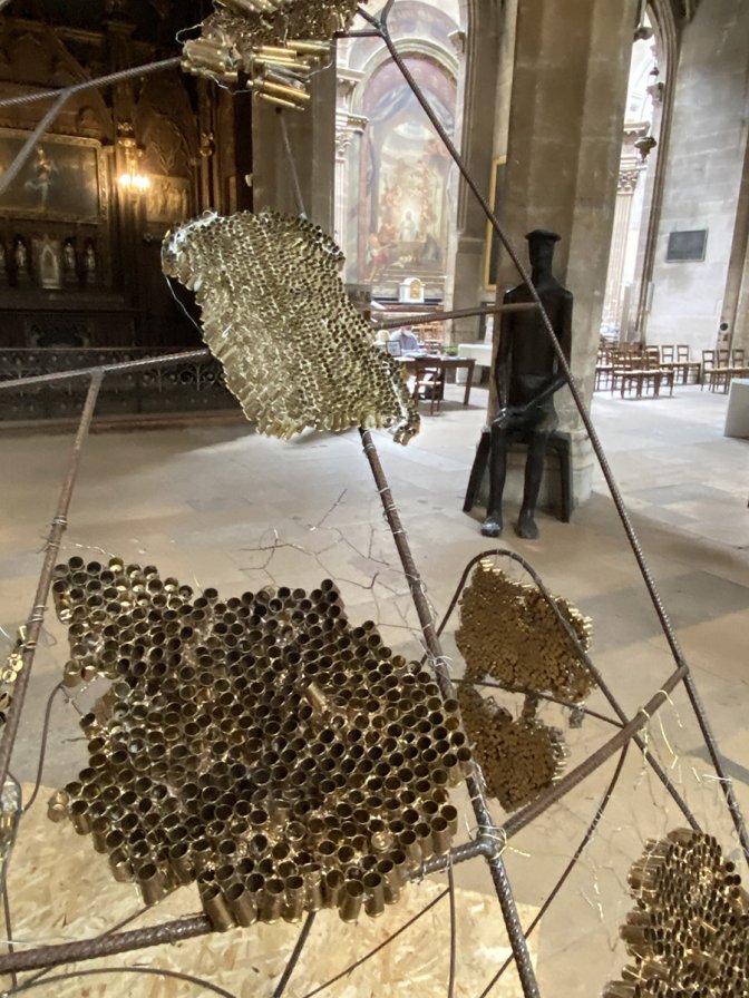 Dans le cadre de l’exposition d’été 2020 à Saint-Merry « Après-After » : une sculpture belle dans son inachèvement qui allie les contraires, une forme dans laquelle on pourrait se réfugier et méditer, une enveloppe alvéolée faite de douilles vides.